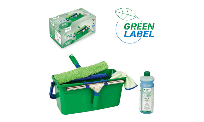 Con il kit per la pulizia delle finestre Green Label (GTK35), UNGER lancia sul mercato il primo set completo al mondo certificato sostenibile per la pulizia dei vetri. Combina materiali riciclati, componenti durevoli “Made in Germany” e materie prime certificate, visibili nel caratteristico design verde-blu, il tutto nella comprovata qualità professionale Unger. Il lavavetri è dotato di un nuovo rivestimento in microfibra di plastica riciclata con fibre abrasive.